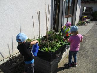 Was vorgezogen werden musste, wie Paprika, Kohlräbchen, Gurken und Tomaten, haben die Kinder ausgesät und fleißig gegossen.