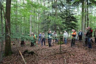 Dieter Steinebach gab dann vor der Exkursion eine Einführung. Auf der sog. „Demo-Fläche“ von ca. 1 Hektar wurden vor etwa 40 Jahren Rotbuchen im Verband 2 x 0,80 m gepflanzt; ferner wurde die Eichen-Naturverjüngung mit Eichen-Wildlingen ausgepflanzt. Durch Anflug und Vogelsaat kamen dann Vogelkirsche, Fichte, Esche, Hainbuche und Walnuss dazu. Das Ziel war die Erzeugung von Wertholz: Stark, astfrei, gesund und gerade sowie gleichmäßig im Jahrring-Aufbau und möglichst spannungsfrei. Die Vorgehensweise war die Auswahl von „Zukunftsbäumen“ nach folgenden Kriterien: Vitalität, Qualität und Verteilung (= Mindestabstand von 15-20 m). Auf Vorschlag des ehemaligen „Waldbautrainers“ Helmut Rieger wurden damals 66 sog. „Z-Bäume“ ausgewählt, markiert und von „Bedrängern“ freigestellt. Damit konnte gewährleistet werden, das jeder Z-Baum genug Freiraum für eine optimale und möglichst gleichmäßige Entwicklung der Kronen erhielt. Um einen wertvollen Stamm zu erzielen ist die Kronenentwicklung enorm wichtig: Die Krone dient als „Zuwachsmotor“; d. h. nur mit großer Krone wird der Baum schnell dick. Ferner wurden die ausgesuchten Zielbäume auf einer Höhe von 6 – 8 m geastet.
