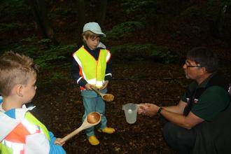 Auf unserem Stammplatz angekommen, musste zuerst das Waldsofa repariert werden. Eifrig machten sich die Schukis auf die Suche nach Stöcken und Ästen. Schnell wurde das Waldsofa aufgemöbelt. So bekam jeder einen guten Sitzplatz, denn erst mussten sie sich beim Frühstücken wieder stärken. Danach hatte Herr Willms ein Spiel für uns vorbereitet. Wir sollten etwas darüber lernen, wie das Wasser von den Wurzeln in die Baumkrone transportiert wird. Dafür stellten sich zwei Kinder nebeneinander auf. Beide Kinder hatten einen großen Holzlöffel der mit Wasser gefüllt wurde. Jetzt mussten die Kinder einen „baumlangen“ Weg zurücklegen und am Ende das Wasser in einen Messbecher schütten.
