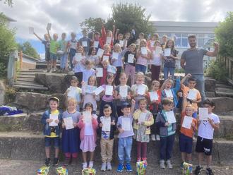 Die Schülerinnen und Schüler der Gutenberg- Schule waren glücklich, dass in diesem Jahr wieder Bundesjugendspiele stattfinden konnten. Die Schukis des Kindergartens Holzbachfrösche hatten die Einladung der Schule angenommen und ebenfalls teilgenommen. Auch zur Siegerehrung der Stufen 1 und 2 kamen sie in die Schule und nahmen stolz ihre Urkunden und Sachpreise entgegen.