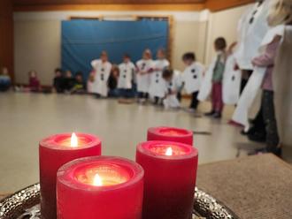 Gegen halb elf trafen sich alle Gruppen zur gemeinsamen Weihnachtsfeier in der Turnhalle. Dort führten uns einige Kinder die Tänze auf, die sie für die Weihnachtsfeier der Landfrauen einstudiert haben.