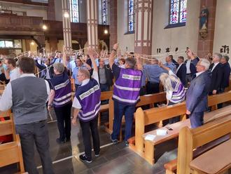 Nach der Predigt wurde darum mit allen Gottesdienst-Teilnehmenden ein Netz geknüpft. Feuerwehrleute, Polizisten, Mitglieder von Hilfsorganisationen wie DRK und Malterser Hilfsdienst, Ärzte, THW, Rettungshundestaffel, Notfallseelsorger, Verwaltungsfachkräfte, Bürgermeister und auch Landrat Achim Hallerbach - alle, die sich ehren- und hauptamtlich für die Hilfe und Rettung ihrer Mitmenschen engagieren, spannten ein Netz, um zu symbolisieren, dass sie durch viele verschiedene Stränge gemeinsam stark sind.