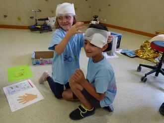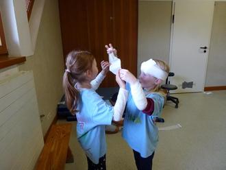 Es wurden verschiedene Verbände besprochen, gezeigt und selbst ausprobiert. Dabei hatten alle Schukis sehr viel Spaß! Und die Eltern staunten nicht schlecht, als sie ihre „schwerverletzten und verarzteten“ Kinder in der KiTa abholten.