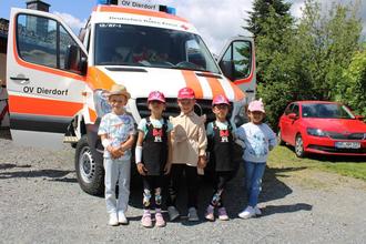 Am 06. Juli hatten die Vorschulkinder aus dem Schulzentrum sowie der Holzbachfrösche einen besonderen Besuch. Die Sanitäter des DRK Ortsverein Dierdorf waren mit ihrem Krankenwagen vor Ort. Sie brachten allen genügend Verbandsmaterial mit, womit sie sich gegenseitig verbinden durften. Das war jedoch nicht alles, ganz aufgeregt ging es für die Schwerverletzten dann in den Krankenwagen, der von ihnen genauestens unter die Lupe genommen wurde. Die Kinder die sich trauten durften sich auch einmal auf die Rettungsliege legen oder sich eine Cervikalstütze (Halskrause) anlegen lassen. Da die Kinder schon einiges an Hintergrundwissen hatten, benannten sie einige der Gegenstände die wir im Wagen fanden, natürlich war ihnen auch die Notrufnummer 112 bekannt. Zum Abschluss durfte sich jedes Kind einmal vorne auf den Beifahrersitz setzen um dort mal einen Überblick zu bekommen und den Blaulicht Knopf betätigen.