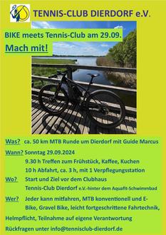 Der Tennis-Club Dierdorf startet in die Herbstsaison mit einem Bike Event. Engagierte Mitglieder hatten die Idee das wunderschöne Clubhaus mit der großen, neu erstellten Sonnenterasse als Start- und Zielpunkt für eine 50 km MTB-Runde (MTV konventionell und E-Bike, Gravel Bike) zu nutzen.