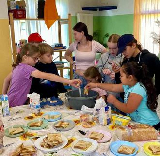 Zum Mittagessen gab es nach den Wünschen der Kinder zusammen gestellte Mahlzeiten und zwischendurch abwechslungsreiche selbst zubereitete Snacks, wie zum Beispiel Waffeln, Sandwich und Rohkost –und Obstplatten. Zusätzlich gab es Überraschungen durch die Eltern mit selbstgebackenen Kreationen.