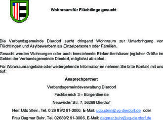 Die Verbandsgemeinde Dierdorf sucht dringend Wohnraum zur Unterbringung von Flüchtlingen und Asylbewerbern als Einzelpersonen oder Familien.