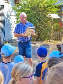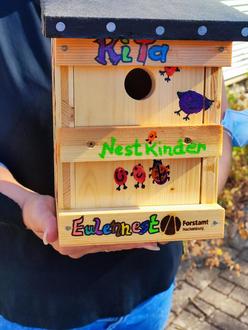 Zum Abschied haben die Eulennestkinder für Hermann ein Vogelhäuschen mit ihren Fingerabdrücken verziert, damit er auch immer eine Erinnerung ans Eulennest hat.