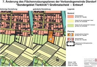 Zur formellen Beteiligung der Öffentlichkeit gemäß § 3 (2) BauGB wird der Entwurf der 7. Änderung des Flächennutzungsplanes für den Bereich des in Aufstellung befindlichen Bebauungsplanes „Sondergebiet Tierklinik“ der Ortsgemeinde Großmaischeid; bestehend aus der Planzeichnung, mit der Begründung einschließlich Umweltbericht sowie den wesentlichen bereits vorliegenden umweltbezogenen Stellungnahmen und Informationen gemäß § 3 (2) BauGB in der Zeit