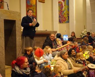 Der Abend begann mit dem feierlichen Einzug der Laternenkinder, die aus den Ecken der Kirche mit dem Lied „Ich geh’ mit meiner Laterne“ zum Altar zogen und dort Platz nahmen.