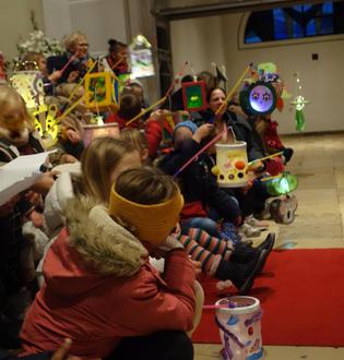 Im Anschluss las Frau Dills die berührende Geschichte „Die geteilte Laterne“ vor, die die Werte von Teilen und Gemeinschaft eindrucksvoll vermittelte. Danach folgte eine Klanggeschichte, die von Frau Peters vorgetragen wurde, während die Erzieherinnen instrumental begleiteten und so eine stimmungsvolle Atmosphäre schufen.