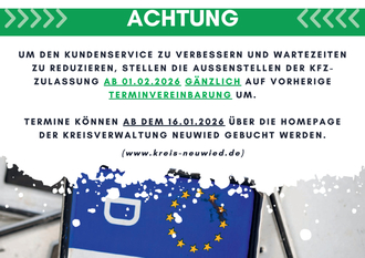 Um den Kundenservice zu verbessern, Wartezeiten zu reduzieren und Abläufe zu optimieren, stellen die Außenstellen der Kfz-Zulassung des Landkreises Neuwied in Linz, Asbach und Dierdorf den Kundenverkehr ab dem 1. Februar 2026 gänzlich auf vorherige Terminvereinbarung um.