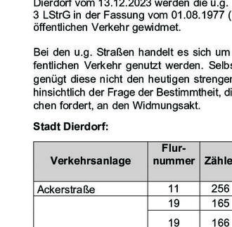 Bei den u.g. Straßen handelt es sich um Verkehrsanlagen, die bereits seit Jahren für den öffentlichen Verkehr genutzt werden. Selbst wenn seinerzeit eine Widmung erfolgt sein sollte, genügt diese nicht den heutigen strengen Anforderungen der Rechtsprechung, insbesondere hinsichtlich der Frage der Bestimmtheit, die eine parzellengenaue Angabe der gewidmeten Flächen fordert, an den Widmungsakt.