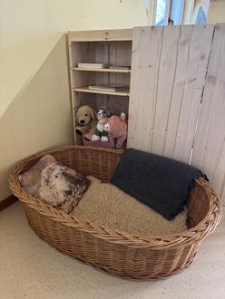 Die Kuscheltiere haben auch ihren neuen Platz in der Gruppe gefunden. Sie werden gerne zum Kuscheln mit ins Körbchen genommen, wenn ein Kind mal eine kleine Pause vom Kindergartentrubel braucht.