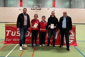 Ehrung der fleißigsten „Sportabzeichensammler“ des TuS Dierdorf (v. l. n. r.: VG-Bürgermeister Manuel Seiler, Walburga Rudolph, Renate Norrmann, Stephan Liesegang, 1. Vorsitzender des TuS Dierdorf Stephan Marker)