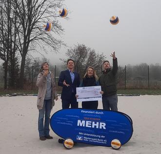 Den Co-Funding Scheck über 3.000 Euro überreichte Geschäftsstellenleiter der Filiale Dierdorf, Daniel Becker, an Thomas Schekorr, den 1. Vorsitzenden und Liane Oettgen, 2. Vorsitzende und Gritt Jacob-Eisenlkolb, Abteilungsleiterin Beachvolleyball, des Tennis-Clubs Dierdorf e. V.