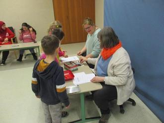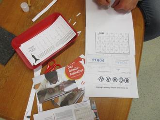 Selbst, dass man den Namen ertasten kann, wie es blinde Menschen machen müssen, konnten wir zeigen. Mit Prickelnadel und Schablone in Brailleschrift wurde der Name auf dem Namenszettel fühlbar. Auch davon haben wir das gesamte Alphabet mitgegeben.