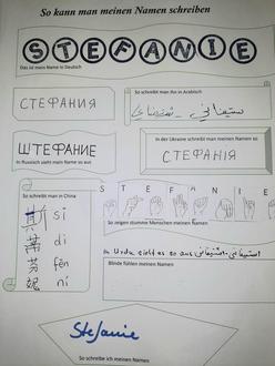 Eltern aus verschieden Nationen hatten sich bereit erklärt, die Namen in ihrer Schrift zu schreiben. So konnten die Kinder nachher ihren Namen nicht nur in Deutsch, sondern auch in Chinesisch, Arabisch, Russisch, Ukrainisch und Persisch lesen.