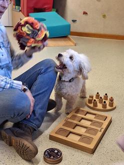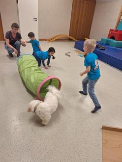 Für spannende Mitmachaktionen wurde ebenfalls gesorgt: Frau Thiemann versteckte Hundefutter in einem Spielball, in einem Memory-Spiel und sogar in einem Geburtstagskuchen. Fiete bewies dabei seinen großen Spürsinn und erschnupperte das versteckte Futter in kürzester Zeit. Auch einen Tunnel entdeckte er und kletterte neugierig hindurch, was die Schukis mit großem Staunen verfolgten.