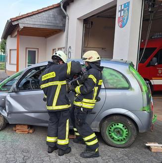 Im Anschluss ging es dann an den PKW. Es galt, den verletzten Fahrer patientenschonend aus dem Fahrzeug zu retten. Nach dem Herausspreizen der Fahrertür war die Begeisterung so groß, dass wir weitergearbeitet haben und am Ende eine große Seitenöffnung erreichten. Dabei wurden beide Türen herausgenommen und im Anschluss noch die komplette B-Säule entfernt.
