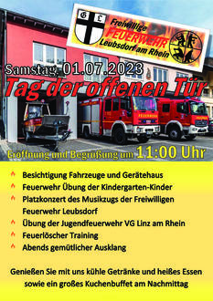 Im Rahmen des Tages der offenen Tür werden wir es allen Besuchern ermöglichen, unser Gerätehaus sowie Fahrzeuge und Geräte zu besichtigen. Hierzu stehen die Kameradinnen und Kameraden der Feuerwehr Leubsdorf für Fragen bereit und beantworten diese gerne.