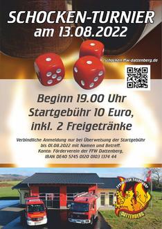 Für das Schockenturnier am Samstag, den 13.08. sind noch Restplätze verfügbar. Interessenten melden sich unter schocken.ffw-dattenberg.de an. Neben tollen Gewinnen wartet auf den Sieger des Turniers erstmalig ein Wanderpokal, ebenfalls wird der Schock-aus-König ausgespielt. Am Sonntag freuen wir uns auf frische Waffeln, Kaffee und Kuchen sowie Gutes vom Grill. Wir freuen uns auf Ihren Besuch.