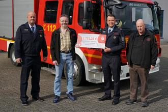 v.l.n.r.: Wehrführer Mario Piovesan, Kassierer Förderverein Dieter Buchholz, stellvertretender Wehrführer André Momm, Vorsitzender des Förderverein Uli Thiel