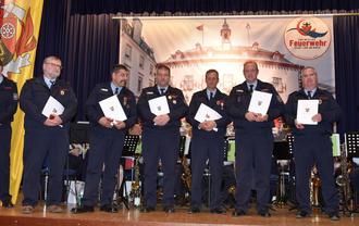 Lars Pörzgen und Martin Wengert (von links) wurden mit dem Silbernen Feuerwehrehrenzeichen ausgezeichnet. Michael Weinberg (3.l.), Andreas Schopp (6.vl.) und Christian Unkel (rechts) sind die neue Spitze der Linzer Wehr.