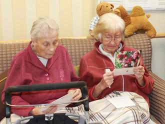 Zwei Seniorinnen beim Lesen der Grußkarten.