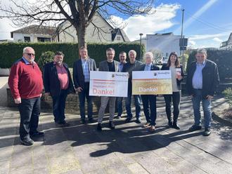 Auf dem Bild vo.li.na.re. Manfred Pees, Udo Franz, Hans-Peter Schmidt (VG-Rat), Fabian Kirsch (Chef der Staatskanzlei), Karl Hauck (VG-Verwaltung), Hans-Martin Born (Beigeordneter), Volker Mendel (Bürgermeister), Jenny Schmitt (VG-Verwaltung), Wolfgang Theis (1. Beigeordneter).