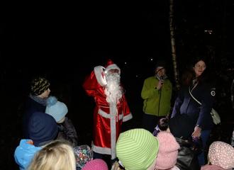Für die Tiere des Waldes schmückten die Kinder wieder kleine Tannenbäume mit Leckereien wie Maiskolben und Möhren und füllten eine Futterkrippe mit Äpfeln, Kastanien und Nüssen. Gegen Ende des Rundgangs traf die Gruppe am Waldklassenzimmer überraschend auf den Nikolaus. Gemeinsam mit den Kindern machte sich dieser dann auf den Weg zum "Eulennest", wo er den Kindern kleine Geschenke überreichte. Am wärmenden Lagerfeuer bei Stockbrot oder Würstchen und dem ein oder anderen Getränk klang schließlich wieder ein schöner Abend als Einstimmung auf das Weihnachtsfest aus.