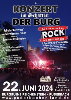 Nach dem tollen Erfolg im Jahr 2022, wird bei der dritten Auflage der Veranstaltungsreihe „Konzert im Schatten der Burg“ in diesem Jahr wieder das Großmaischeider Classic-ROCK-Commando am Fuße des Burgberges die hierfür extra aufgebaute Bühne mit feinsten Coverrock der letzten Jahrzehnte beben lassen. Für das passende Ambiente wird die Burg zu diesem Event angestrahlt. Während der Veranstaltung wird ein kostenloser Pendelfahrdienst ab 18.45 Uhr aus den Gemeinden Puderbach (Ortsmitte), Steimel (Marktplatz), Raubach (Busbahnhof) und Daufenbach (Haltestelle bei Landhaus Haag) angeboten, wo unter anderem ausreichend Parkmöglichkeiten zur Verfügung stehen. Für das leibliche Wohl wird bestens gesorgt sein.