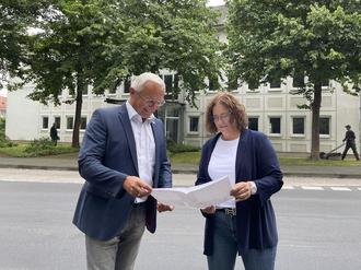 Landrat Achim Hallerbach und die neue Impfkoordinatorin Sabrina Kahn aus dem Gesundheitsamt vor dem künftigen Impfzentrum des Kreises in Niederbieber. Noch sind einige Arbeiten im und rund um das ehemalige Bürogebäude vorzunehmen, grundsätzlich sind die Voraussetzungen aber optimal.