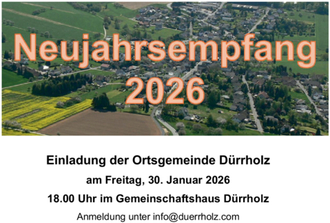 Den Ratsmitgliedern der Ortsgemeinde Dürrholz und mir als Ortsbürgermeister wäre es eine Freude, Sie/Euch beim Neujahrsempfang am 30. Januar 2026 ab 18 Uhr im Gemeinschaftshaus in Dürrholz begrüßen zu dürfen.