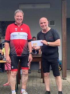 „So sind nun schon einige Tausend Euro zusammengekommen und wir freuen uns über diese Partnerschaft, die man fast als Freundschaft bezeichnen kann“ so Vorstandsmitglied des Fonds Heiko Marmé (re.), der sich in diesem Jahr aktiv der E-Bike Gruppe des Events anschloss und nach 43 Kilometern dankbar die Spende von TuS-Vorsitzenden Bernd Nöllgen (li.) entgegennehmen konnte. Dieser ergänzte: „Uns ist wichtig, dass wir wissen, was mit dem Geld passiert und dass es hier in der Region gut eingesetzt wird. Darauf können wir uns beim Gundlach-Stiftungsfonds verlassen, denn wir kennen die Aktivitäten und Personen seit Jahren sehr gut“. Zum Ende des offiziellen Teils moderierte der Vorsitzende eine üppige Verslosung, deren Preise die Sponsoren der Veranstaltung spendiert hatten. Anschließend ließen Sportler und Organisatoren das gelungene Event ausklingen und erholte sich bei kühlen Getränken von dem glutheißen Tag auf den Rädern.