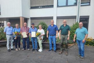 In einer kleinen Feierstunde dankten Bürgermeister Volker Mendel, Revierleiter Tobias Kämpf, Büroleiter Philipp Rasbach und Personalratsvorsitzender Heiko Weller den beiden Jubilaren für die jahrzehntelangen treuen Dienste. Den Ehefrauen überreichte Bürgermeister Mendel einen Blumenstrauß.