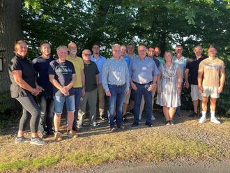 Anja Meckes-Sokola, am Eingang des Naturerlebnispfades - Dürrholz V.l.n.r.: Angelika Fromholz, Michél Steeg, Frank Lammers, Franz-Josef Ludwig, Martin Schäfer, Max Kambeck, Stephan Sokola, Sergej Botter, Andreas Kambeck, Dietmar Neitzert, Philip Asbach, Christian Reusch, Christina Heinz, Mario Schumacher, Markus Beier, Andre Neitzert, es fehlt Herr Patrick Pleyer.