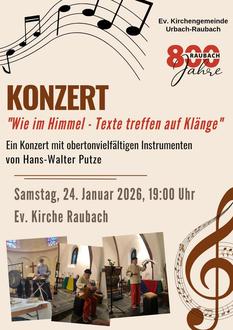 Am 24.01.2026 findet in der Raubacher Kirche von 19.00 Uhr bis 20.30 Uhr ein außergewöhnliches Konzert mit dem Klangimpressionisten Hans Walter Putze statt.