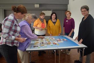 Die Frauen beim Einsortieren der Karten auf der Ernährungspyramide mit der Referentin Dr. Ursula Kannengießer, der Mitarbeiterin der Gesundheitsförderung der Kreisverwaltung Neuwied, Rita Hoffmann-Roth, und der Gleichstellungsbeauftragten der Verbandsgemeinde Puderbach.