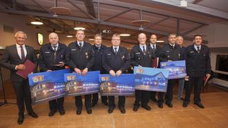 Die Geehrten mit Landrat Achim Hallerbach, Beigeordnetem Hans-Martin Born, BKI Holger Kurz, und Wehrleiter Alexander Neuer.