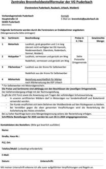 b) Sie nutzen das Bestellformular und senden dieses bitte per Post an die VG Puderbach. Gerne kann das Formular auch digital an brennholz@puderbach.de übertragen werden.