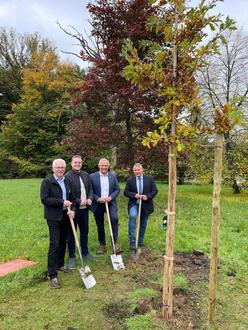Baumpflanzung im Ortsteil Brubbach (v. li.) Verbandsbürgermeister Volker Mendel, Bundestagsabgeordneter Martin Diedenhofen, Landrat Achim Hallerbach und Ortsbürgermeister Gerd Schumacher