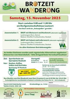 Auf einer ca. 14 Kilometer langen, extra für diesen Tag ausgeschilderten Wanderung geht es vom Startpunkt in Lautzert zum Zielpunkt am Sportplatz Raubach. Im Verlauf der Wanderung kommen Sie an zwei Jausenstationen vorbei wo Essen und Trinken gereicht werden.