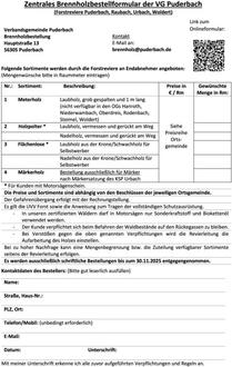 Auch in diesem Jahr können Sie Ihre Brennholzbestellung wieder digital auf der Homepage der VG Puderbach (www.puderbach.de unter „Aktuelles“) oder in Papierform über das im Mitteilungsblatt veröffentlichte Formular durchführen.