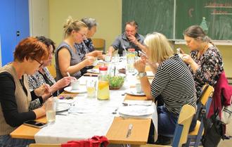 Am 25.11.2024 kochte die Dozentin Mirjam Dietz mit interessierten Teilnehmer:innen ein leckeres und fantasievolles viergängiges Weihnachtsmenü, basierend auf gesunden Lebensmitteln, die überall erhältlich sind. Dabei wurden neue Speisen ausprobiert, wie zum Beispiel Blini mit Forelle und rote Bete, Lachs im Blätterteig oder Altbewährtes neu interpretiert, wie zum Beispiel Feldsalat mit Granatapfel und Walnüssen oder kleine Kohlrouladen, die nicht nur mit Hack, sondern auch mit Feta gefüllt waren.