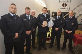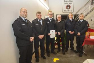 Von links: Wehrleiter Alexander Neuer, Wehrführer Peter Reusch, Maximilian Baier, Bürgermeister Volker Mendel, stellvertretender Wehrleiter Dieter Klein-Ventur und stellvertretender Wehrführer Hendrick Kind.