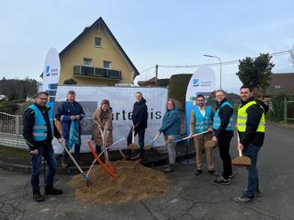 Foto: Luca Sardini (POS DG) / Spatenstich in Dürrholz – die Verbandsgemeinde packt tatkräftig mit an. V.l.n.r.: Lars Mathé (Bauleiter DG), Ulrich Neitzert (1. Beigeordneter), Anette Wagner (Ortsbürgermeisterin), Franz Josef Ludwig (2. Beigeordneter), Tatjana Kauth (Tiefbauamt VG Puderbach), Sezer Carikci (Projektmanager Bauvermarktung DG), Andreas Wiebe (Projektleiter Bau DG), Konstantinos Florokapis (Projektleiter Artemis)