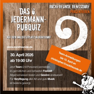 Den Auftakt macht am 30. April ab 19 Uhr das Jedermann-Pubquiz im gemütlichen und beheizten Rockfreunde-Zelt. Teams mit 2 bis maximal 8 Personen können dabei ihr Wissen in verschiedenen Quizrunden unter Beweis stellen – von Allgemeinwissen bis zu kniffligen Spezialfragen. Teilnehmen können alle Quizfreunde ab 16 Jahren. Am Ende winken natürlich auch attraktive Preise für die besten Teams.