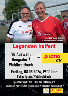 Ein besonderes sportliches Highlight steht in der Verbandsgemeinde Rengsdorf-Waldbreitbach bevor: Am Freitag, den 08. Mai 2026, trifft eine Auswahlmannschaft der Verbandsgemeinde unter dem Motto „Legenden helfen“ auf die Lotto-Elf. Anpfiff ist um 19:00 Uhr auf dem Rasenplatz in Waldbreitbach.