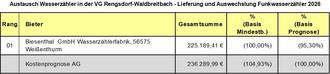 | - | Die Firma Biesenthal Wasserzähler GmbH, Weißenthurm, hat das wirtschaftlichste Angebot vorgelegt. |